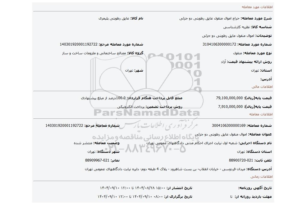 نام دستگاه اجرایی: شعبه اول نیابت اجرای احکام مدنی دادگاههای عمومی تهرانوضعیت معامله: منتشر شده