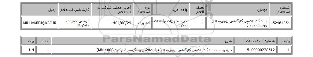 | 52461354 | دستگاه بالانس کارگاهی یونیورسال( پیوست دارد ) | 1 | خرید تجهیزات وقطعات یدکی | کشوری | 1404/08/29 | مرتضی حمیدی دهکردی | MR.HAMIDI@KSC.IR |