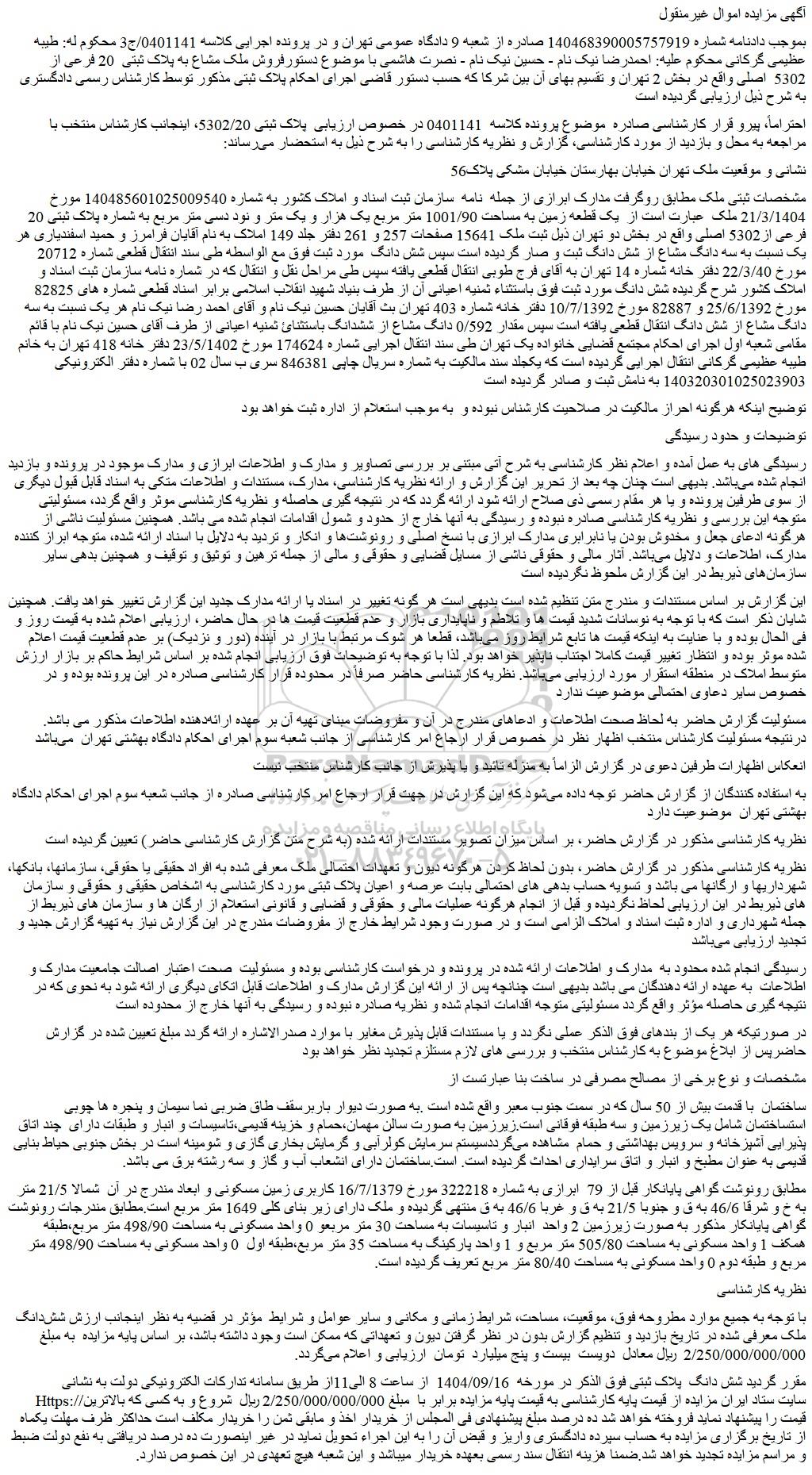 بموجب دادنامه شماره 140468390005757919 صادره از شعبه 9 دادگاه عمومی تهران و در پرونده اجرایی کلاسه 0401141/ج3 محکوم له: طیبه عظیمی گرکانی محکوم علیه: احمدرضا نیک نام - حسین نیک نام - نصرت هاشمی با موضوع دستورفروش ملک مشاع به پلاک ثبتی 20 فرعی از 5302 اصلی واقع در بخش 2 تهران و تقسیم بهای آن بین شرکا که حسب دستور قاضی اجرای احکام پلاک ثبتی مذکور توسط کارشناس رسمی دادگستری به شرح ذیل ارزیابی گردیده است