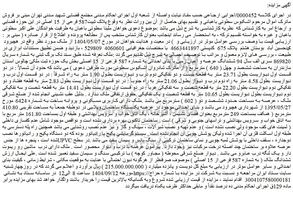 در اجرای کلاسه 0000452/اجرایی ارجاعی حسب مفاد نیابت واصله از شعبه اول اجرای احکام مدنی مجتمع قضایی شهید مدنی تهران مبنی بر فروش ماترک اموال مرحوم اشکبوس سطوتی باغبانی و تقسیم بهای حاصل از آن بین وراث نظر به وقوع پلاک ثبیت587 فرعی از 15 اصلی در این حوزه قضایی و ارجاع امر به کارشناس که نظریه کارشناسی به شرح ذیل می باشد :موضوع دعوی خواهان ملینا سطوتی باغبان به طرفیت خواندگان علی اکبر سطوتی باغبان و غیره به خواسته تقسیم ترکه ، به استحضار می رساند اینجانب بعنوان کارشناس منتخب پس از مطالعه پرونده و اطلاع از قرار صادره ( مبنی بر : ارزیابی قیمت با وصف بررسی عوامل موثر در ارزیابی و ) در معیت و هدایت خواهان در مورخ 1404/05/07 از ملک مورد نظر واقع در هچیرود محمدحسین آباد بوستان هشتم پلاک 675 کدپستی 4663441897 با مختصات جغرافیایی 4060601 529809 ، بازدید و ضمن تطبیق مستندات ابرازی در طبیعت ، بررسی های لازم معمول و مراتب با توصیف اجمالی به شرح ذیل تقدیم می گردد :ملک تعرفه شده طبق سند تک برگ ثبتی به شماره سریال 869820 سری الف سال 94 ششدانگ عرصه و اعیان زمین با بنای احداثی به شماره 587 فرعی از 15 اصلی بخش یک حوزه ثبت ملکئ چالوس استان مازندران به مساحت ششصد و چهل ( 640 ) مترمربع ( از ماترک شادروان اشکبوس سطوتی مورث طرفین دعوی ) می باشد که حدود آن شمالاً : در دو قسمت اول دیواریست بطول 23.71 متر به قطعه بیست و دو تفکیکی دوم درب و دیواریست بطول 1.90 متر به راه شرقاً : در دو قسمت اول درب و دیواریست بطول 4.58 متر به راه دوم درب و دیوار بطول 21.06 متر به راه جنوباً : در دو قسمت اول دیواریست بطول 2.83 متر به قطعه هفتاد و دو تفکیکی دوم دیواریست بطول 22.20 متر به قطعه شصت و سه تفکیکی غرباً : در دو قسمت اول دیواریست بطول 14.41 متر به قطعه شصت و سه تفکیکی دوم دیواریست بطول دیواریست بطول 10.65 متر به قطعه شصت و یک تفکیکی .حقوق ارتفاقی ملک ندارد . بدلیل عقب نشینی انجام شده از ضلع شرقی ملک ، عرصه به مساحت حدود ششصد و دو ( 602 ) مترمربع می باشد .ملک دارای کاربری مسکونی و پروانه ساخت به شماره 6424 مورخ 1395/05/27 از شهرداری هچیرود می باشد و بنای احداثی موجود در عرصه یکدستگاه ساختمان ویلایی در دوطبقه جمعاً به مساحت تقریبی 410.80 مترمربع ( همکف بمساحت 249 مترمربع بعنوان فضای نشیمن ، آشپزخانه ، یک اتاق خواب و سرویس بهداشتی و طبقه اول بمساحت 161.80 متر مربع با سه اتاق خواب و سرویس بهداشتی و تراسهای جنوبی و شرقی ) است . ساختمان تاکنون بهره برداری نشده است و نواقص موجود شامل عدم کفسازی داخلی ( لمینت های کف موجود ولی نصب نشده است ) و عدم تهیه و نصب شیرآلات ، سینک و گاز و نیز عدم نصب روشنایی می باشد همچنین راه پله دسترسی به طبقه اول اسکلت فلزی آن اجرا شده ولیکن پوشش چوبی آن انجام نشده است . سیستم گرمایشی پکیج با رادیاتور بوده که دو دستگاه پکیج و رادیاتورها نصب شده است ، پنجره ها از جنس upvc دوجداره ، سقف داخلی با پوشش لمبه چوبی و نمای ساختمان ترکیبی از سنگ بادبر و سیمان سفید می باشد .در سطح عرصه علاوه بر ساختمان چند اصله درخت مرکبات نیز وجود دارد . پیرامون عرصه با درب و دیوار محصور است . ملک دارای درب ماشین رو ریموت دار و یک لنگه درب عابرو می باشد . دیوار ضلع شرقی محوطه ( مجاور کوچه ) با ترکیبی سنگ و سیمان سفید تعمیر شده است .علی ایحال ارزش ششدانگ ملک ( به شماره 587 فرعی از 15 اصلی ) موصوف صرفنظر از هرگونه دیون احتمالی با عنایت به موقعیت مکانی ، شرایط زمانی ، کیفیت بنای احداثی و سایر عوامل موثر در ارزیابی به مبلغ کل دویست و پانزده میلیارد ( 215.000.000.000 ) ریال برآورد و اعلام می گردد که در روزچهارشنبه مورخه 1404/09/12 ساعت 8 الی12 در سامانه ستاد به نشانی سایت ستاد ایران مراجعه و نسبت به شرکت در مزایده با شماره حراج 3004107580000181 اقدام نمایند ، مزایده از قیمت ارزیابی شده شروع وبه کسانیکه بالاترین قیمت را خریدار باشند واگذار خواهد شد بهای مزایده برابر ماده 129ق اجرای احکام مدنی ده درصد نقداً و مابقی حداکثر ظرف یکماه دریافت میگردد
