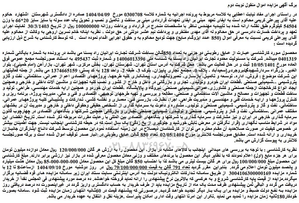 در راستای اجرای مفاد نیابت اعطایی به کلاسه مربوط به پرونده اجرائیه به شماره کلاسه 0300708 مورخ 1404/04/09 صادره از دادگستری شهرستان اشتهارد حکوم علیه آقای پیرعلی کریمی محکوم است به ایفای تعهد مبنی بر ایفای تعهدات قراردادی مبنی بر ساخت و تکمیل و نصب و تحویل یک عدد سوله با سایز سایز 20*66 با وزن 54504 کیلوگرم طبق نقشه ارائه شده با تأییدیه مهندس ناظر با مشخصات مندرج در قرارداد و پرداخت روزانه 100000000 ریال از تاریخ 30/3/1403 لغایت اجرای تعهد و پرداخت خسارت دادرسی در حق محکوم له آقای مهدی مفتخری و پرداخت نیم عشر دولتی در حق دولت ، نظربه اینکه خانم نسرین اروجی به وکالت از محکوم علیه آقای پیرعلی کریمی نسبت به معرفی اموال (850 عدد ایزوگام مایع) جهت تودیع محکوم به و حقوق اجرایی اقدام نموده است . که توسط کارشناس به شرح ذیل ارزیابی گردیده است :