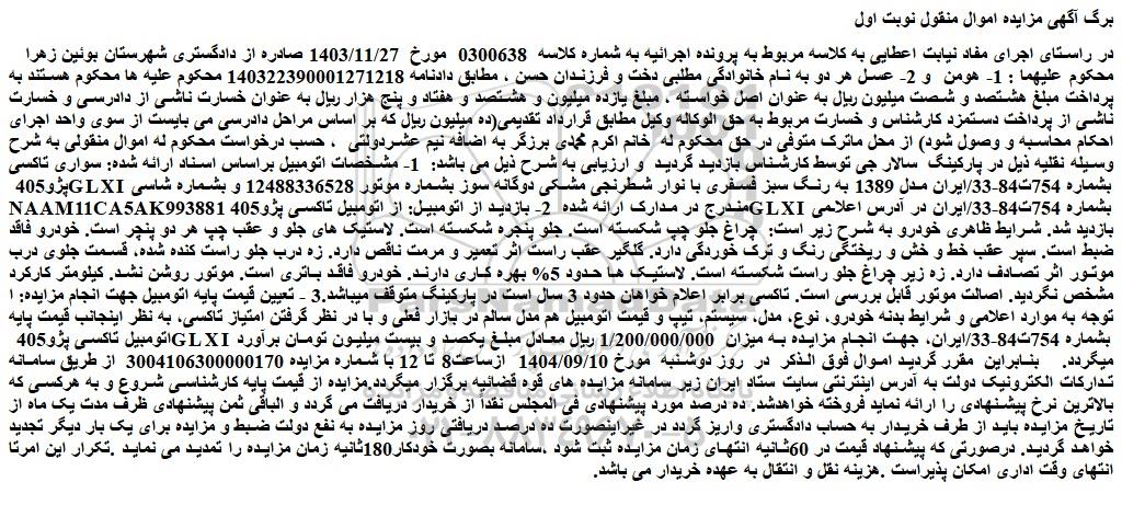 در راستای اجرای مفاد نیابت اعطایی به کلاسه مربوط به پرونده اجرائیه به شماره کلاسه 0300638 مورخ 1403/11/27 صادره از دادگستری شهرستان بوئین زهرا محکوم علیهما : 1- هومن و 2- عسل هر دو به نام خانوادگی مطلبی دخت و فرزندان حسن ، مطابق دادنامه 140322390001271218 محکوم علیه ها محکوم هستند به پرداخت مبلغ هشتصد و شصت میلیون ریال به عنوان اصل خواسته ، مبلغ یازده میلیون و هشتصد و هفتاد و پنج هزار ریال به عنوان خسارت ناشی از دادرسی و خسارت ناشی از پرداخت دستمزد کارشناس و خسارت مربوط به حق الوکاله وکیل مطابق قرارداد تقدیمی(ده میلیون ریال که بر اساس مراحل دادرسی می بایست از سوی واحد اجرای احکام محاسبه و وصول شود) از محل ماترک متوفی در حق محکوم له خانم اکرم محمدی برزگر به اضافه نیم عشردولتی ، حسب درخواست محکوم له اموال منقولی به شرح وسیله نقلیه ذیل در پارکینگ سالار جی توسط کارشناس بازدید گردید و ارزیابی به شرح ذیل می باشد: 1- مشخصات اتومبیل براساس اسناد ارائه شده: سواری تاکسی پژو405 glxi بشماره 754ت84-33/ایران مدل 1389 به رنگ سبز فسفری با نوار شطرنجی مشکی دوگانه سوز بشماره موتور 12488336528 و بشماره شاسی naam11ca5ak993881 مندرج در مدارک ارائه شده 2- بازدید از اتومبیل: از اتومبیل تاکسی پژو405 glxi بشماره 754ت84-33/ایران در آدرس اعلامی بازدید شد. شرایط ظاهری خودرو به شرح زیر است: چراغ جلو چپ شکسته است. جلو پنجره شکسته است. لاستیک های جلو و عقب چپ هر دو پنچر است. خودرو فاقد ضبط است. سپر عقب خط و خش و ریختگی رنگ و ترک خوردگی دارد. گلگیر عقب راست اثر تعمیر و مرمت ناقص دارد. زه درب جلو راست کنده شده، قسمت جلوی درب موتور اثر تصادف دارد. زه زیر چراغ جلو راست شکسته است. لاستیک ها حدود 5% بهره کاری دارند. خودرو فاقد باتری است. موتور روشن نشد. کیلومتر کارکرد مشخص نگردید. اصالت موتور قابل بررسی است. تاکسی برابر اعلام خواهان حدود 3 سال است در پارکینگ متوقف میباشد.3 - تعیین قیمت پایه اتومبیل جهت انجام مزایده: ا توجه به موارد اعلامی و شرایط بدنه خودرو، نوع، مدل، سیستم، تیپ و قیمت اتومبیل هم مدل سالم در بازار فعلی و با در نظر گرفتن امتیاز تاکسی، به نظر اینجانب قیمت پایه اتومبیل تاکسی پژو405 glxi بشماره 754ت84-33/ایران، جهت انجام مزایده به میزان 1/200/000/000 ریال معادل مبلغ یکصد و بیست میلیون تومان برآورد میگردد. بنابراین مقرر گردید اموال فوق الذکر در روز دوشنبه مورخ 1404/09/10 ازساعت8 تا 12 با شماره مزایده 3004106300000170 از طریق سامانه تدارکات الکترونیک دولت به آدرس اینترنتی سایت ستاد ایران زیر سامانه مزایده های قوه قضائیه برگزار میگردد.مزایده از قیمت پایه کارشناسی شروع و به هرکسی که بالاترین نرخ پیشنهادی را ارائه نماید فروخته خواهدشد. ده درصد مورد پیشنهادی فی المجلس نقداً از خریدار دریافت می گردد و الباقی ثمن پیشنهادی ظرف مدت یک ماه از تاریخ مزایده باید از طرف خریدار به حساب دادگستری واریز گردد در غیراینصورت ده درصد دریافتی روز مزایده به نفع دولت ضبط و مزایده برای یک بار دیگر تجدید خواهد گردید. درصورتی که پیشنهاد قیمت در 60ثانیه انتهای زمان مزایده ثبت شود ،سامانه بصورت خودکار180ثانیه زمان مزایده را تمدید می نماید .تکرار این امرتا انتهای وقت اداری امکان پذیراست .هزینه نقل و انتقال به عهده خریدار می باشد.