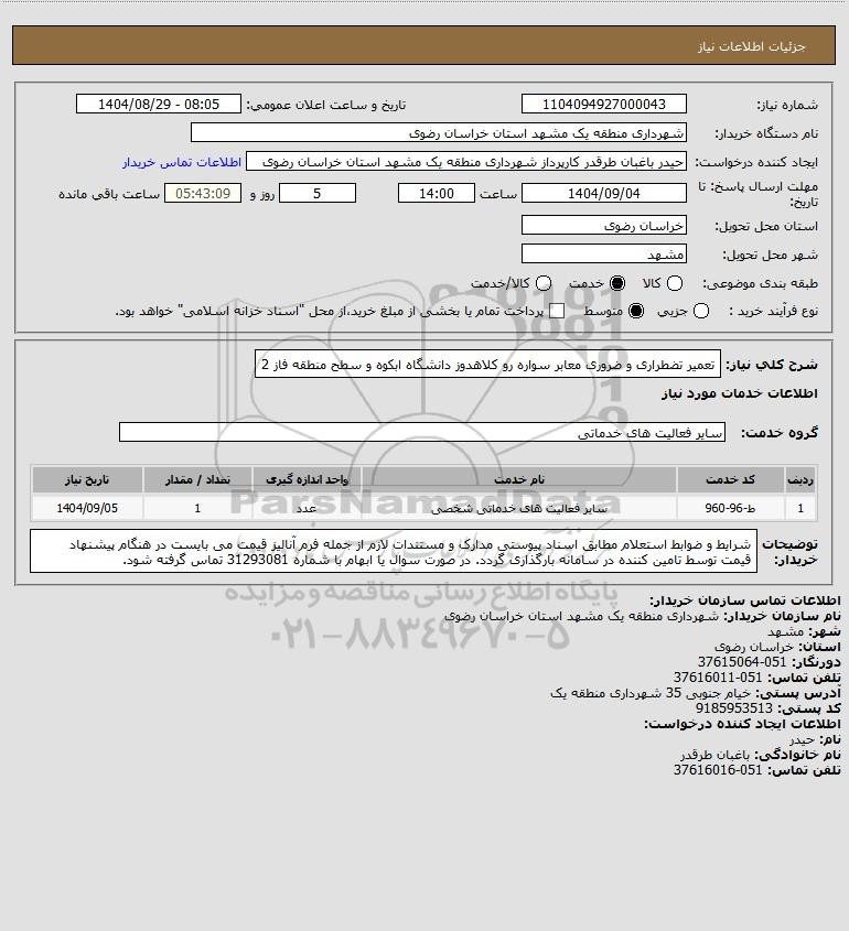 نام سازمان خریدار: شهرداری منطقه یک مشهد استان خراسان رضوی