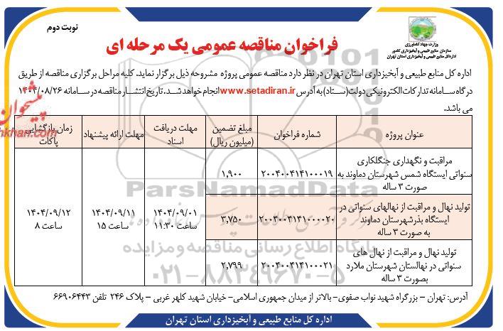 اداره کل منابع طبیعی و آبخیزداری استان تهران در نظر دارد مناقصه عمومی پروژه مشروحه ذیل را از طریق سامانه تدارکات الکترونیکی دولت برگزار نماید. کلیه مراحل برگزاری مناقصه از دریافت اسناد مناقصه تا ارائه پیشنهاد مناقصه گران و بازگشایی پاکت ها از طریق درگاه سامانه تدارکات الکترونیکی دولت (ستاد) ایران انجام خواهد شد . تاریخ انتشار مناقصه در سامانه 1404.8.26 می باشد.