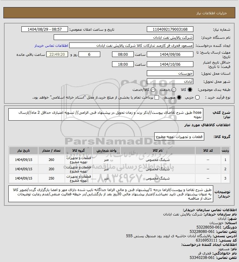 استعلام hose طبق شرح تقاضای پیوست//ذکر برند و زمان تحویل در پیشنهاد فنی الزامی// تسویه اعتباری حداقل 2 ماه//ارسال نمونه, استعلام hose طبق شرح تقاضای پیوست//ذکر برند و زمان تحویل در پیشنهاد فنی الزامی// تسویه اعتباری حداقل 2 ماه//ارسال نمونه