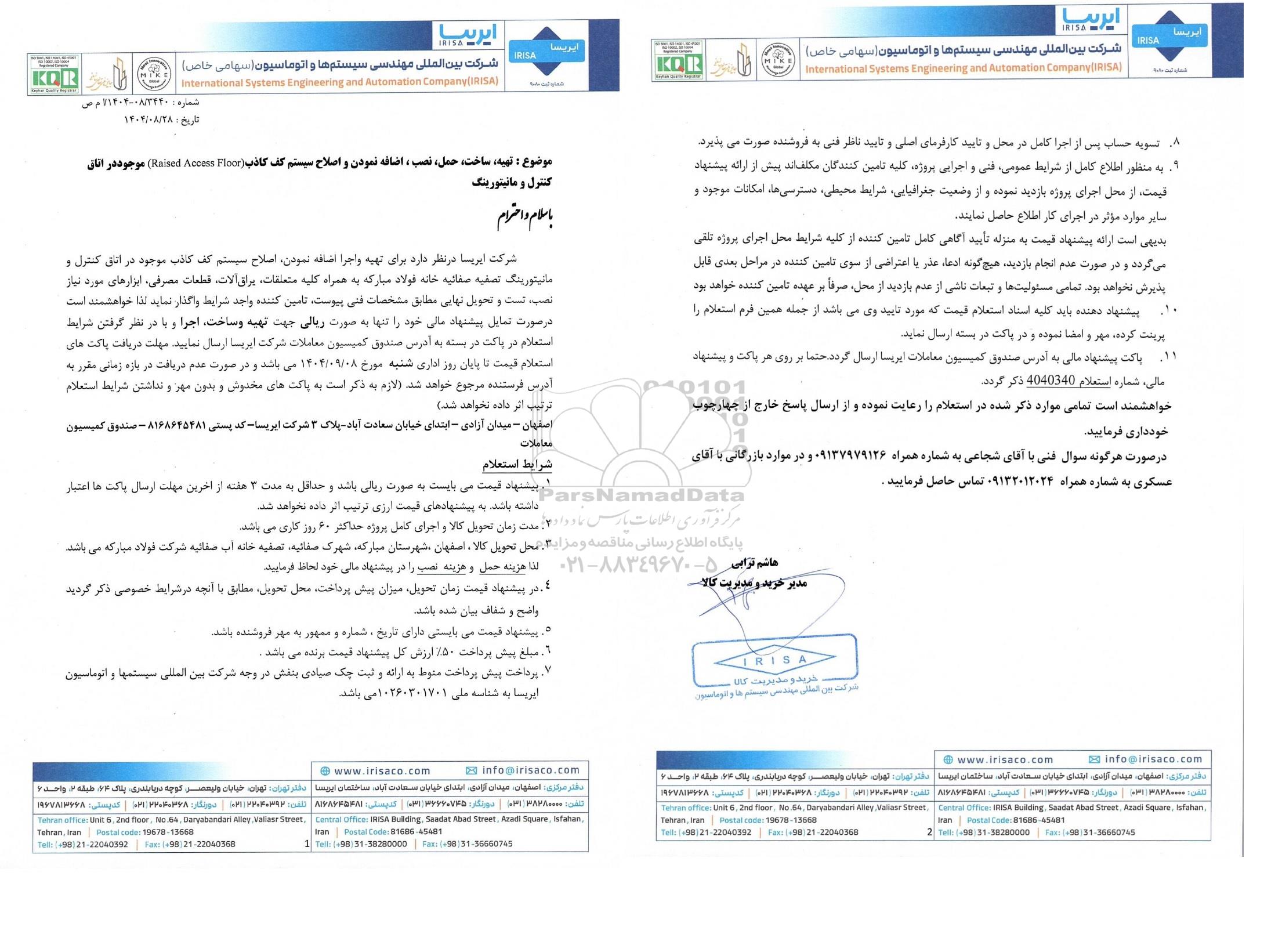 شرکت ایریسا در نظر دارد برای تهیه و اجرا اضافه نمودن، اصلاح سیستم کف کاذب موجود در اتاق کنترل و مانیتورینگ تصفیه صفائیه خانه فولاد مبارکه به همراه کلیه متعلقات، یراق آلات، قطعات مصرفی، ابزارهای مورد نیاز نصب، تست و تحویل نهایی مطابق مشخصات فنی پیوست، تامین کننده واجد شرایط واگذار نماید لذا خواهشمند است در صورت تمایل پیشنهاد مالی خود را تنها به صورت ریالی جهت تهیه و ساخت، اجرا و با در نظر گرفتن شرایط استعلام در پاکت در بسته به آدرس صندوق کمیسیون معاملات شرکت ایریسا ارسال نمایید. مهلت دریافت پاکت های استعلام قیمت تا پایان روز اداری شنبه مورخ 1404.09.08 می باشد و در صورت عدم دریافت در بازه زمانی مقرر به آدرس فرستنده مرجوع خواهد شد. (لازم به ذکر است به پاکت های مخدوش و بدون مهر و نداشتن شرایط استعلام ترتیب اثر داده نخواهد شد.)