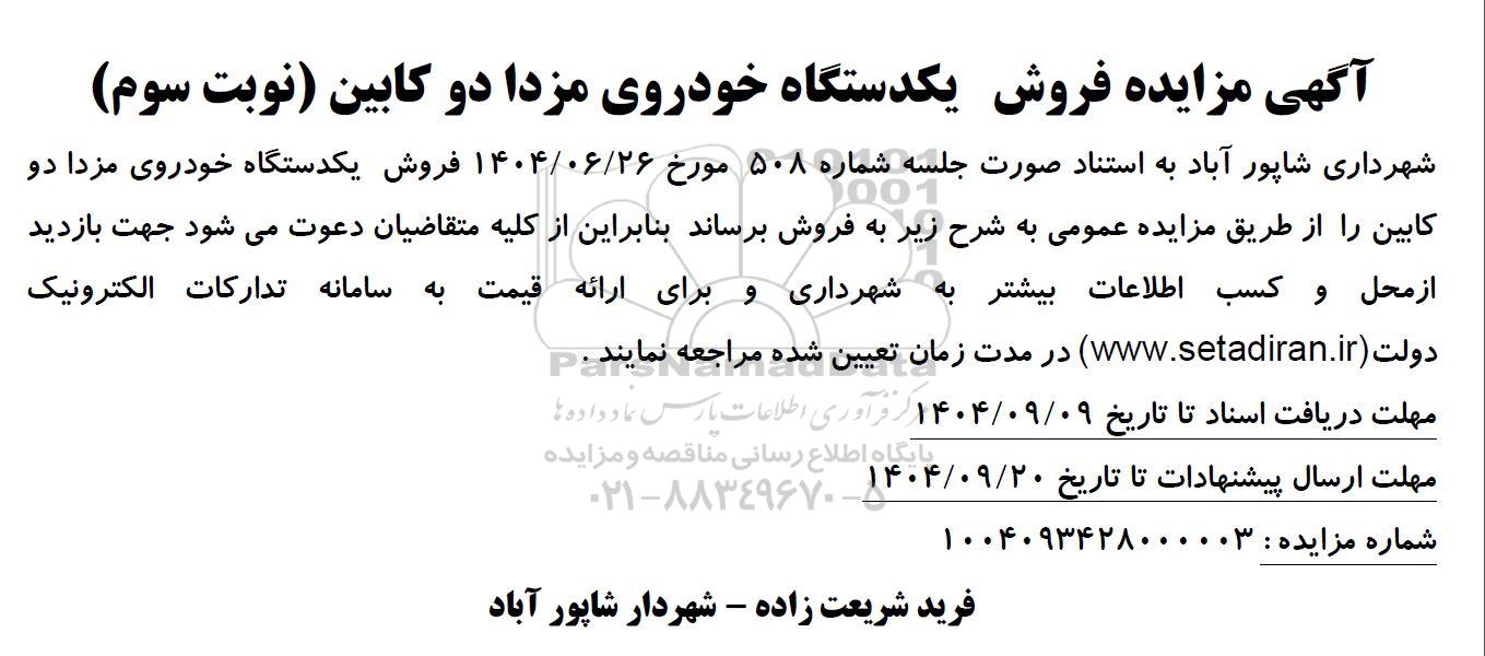 شهرداری شاپور آباد به استناد صورت جلسه شماره 508 مورخ 1404.06.26 فروش یکدستگاه خودروی مزدا دو کابین را از طریق مزایده عمومی به شرح زیر به فروش برساند بنابراین از کلیه متقاضیان دعوت میشود جهت بازدید از محل و کسب اطلاعات بیشتر به شهرداری و برای ارائه قیمت به سامانه تدارکات الکترونیک دولت (سایت ستاد ایران ) در مدت زمان تعیین شده مراجعه نمایند.