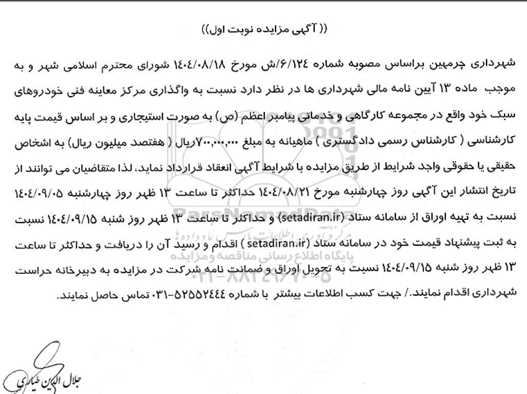 شهرداری چرمهین بر اساس مصوبه شماره 6/124/ش مورخ 1404.8.18 شورای محترم اسلامی شهر و به موجب ماده 13 آیین نامه مالی شهرداری ها در نظر دارد نسبت به واگذاری مرکز معاینه فنی خودروهای سبک خود واقع در مجموعه کارگاهی و خدماتی پیامبر اعظم (ص) به صورت استیجاری و بر اساس قیمت پایه کارشناسی ( کارشناس رسمی دادگستری ) ماهیانه به مبلغ 700.000.000 ریال (هفتصد میلیون ریال) به اشخاص حقیقی یا حقوقی واجد شرایط از طریق مزایده با شرایط آگهی انعقاد قرارداد نماید. لذا متقاضیان می توانند از تاریخ انتشار این آگهی روز چهارشنبه مورخ 1404.08.21 حداکثر تا ساعت 13 ظهر روز چهارشنبه مورخ 1404.9.5 نسبت به تهیه اوراق از سامانه ستاد (ستاد ایران) و حداکثر تا ساعت 13 ظهر روز شنبه 1404.09.15 نسبت به ثبت پیشنهاد قیمت خود در سامانه ستاد (ستاد ایران) اقدام و رسید آن را دریافت و حداکثر تا ساعت 13 ظهر روز شنبه 1404.09.15 نسبت به تحویل اوراق و ضمانت نامه شرکت در مزایده به دبیرخانه حراست شهرداری اقدام نمایند. جهت کسب اطلاعات بیشتر با شماره 52552444 - 031 تماس حاصل نمایند.