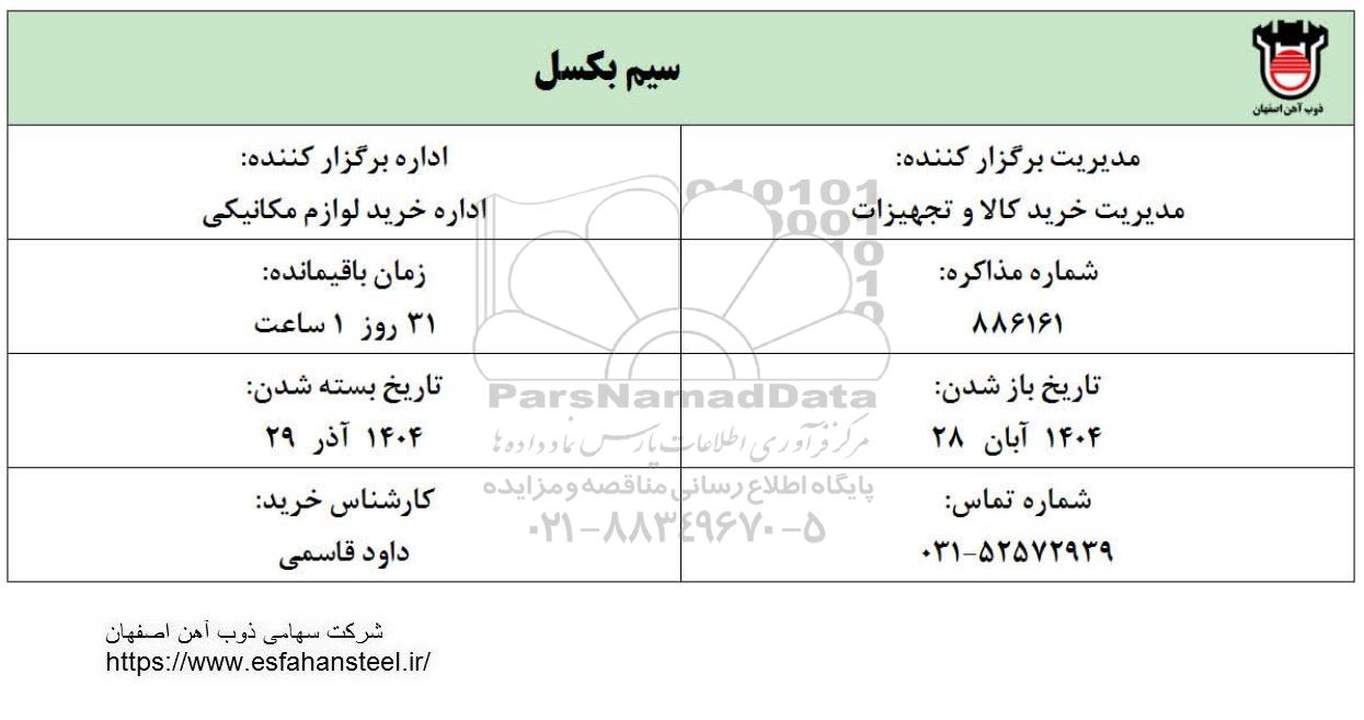 استعلام بها و موضوع استعلام استعلام سیم بکسل به اطلاع کلیه شرکتها و افراد متخصص واجد شرایط میرساند، آگهی گذار در نظر دارد از طریق استعلام بها، نسبت به انتخاب و دریافت پیشنهادات اقدام نماید. این استعلام با کد آگهی ثبت شده در سامانه خبرگزاری پارس نماد : 9882128 منتشر شده است. مشخصات استعلام : تاریخ شروع استعلام: 1404/08/29 آخرین مهلت ارسال پیشنهاد قیمت : 1404/09/29 و محل اجرای پروژه : استان مناقصات استان اصفهان میباشد. استعلام قیمت مورد درخواست : استعلام سیم بکسل با دستهبندیهای تخصصی و گروه های مرتبط : ابزار و یراق آلات, سیم بکسل, استعلام اطلاع رسانی میگردد.