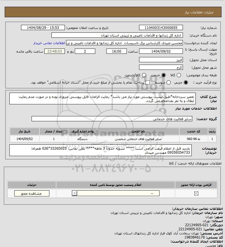 شرح کلی نیاز: تعمیر سردخانه*طبق لیست پیوستی مورد نیاز می باشد* رعایت الزامات فایل پیوستی ضروری بوده و در صورت عدم رعایت ابطال و به نفر بعداعلام می گردد.