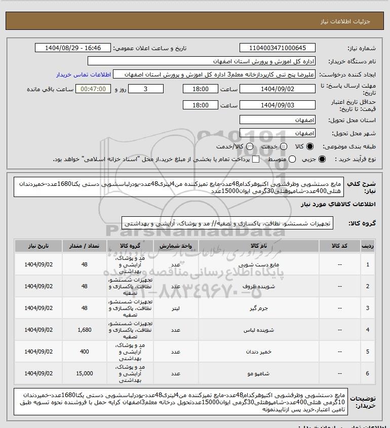 شرح کلی نیاز: مایع دستشویی وظرفشویی اکتیوهرکدام48عدد-مایع تمیزکننده من4لیتری48عدد-پودرلباسشویی دستی یکتا1680عدد-خمیردندان هتلی400عدد-شامپوهتلی30گرمی ایوان15000عدد