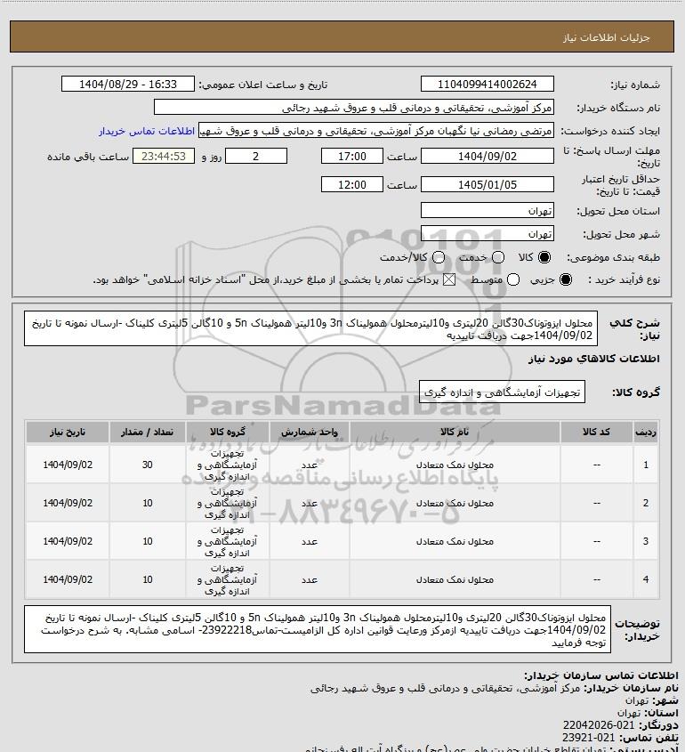 شرح کلی نیاز: محلول ایزوتوناک30گالن 20لیتری و10لیترمحلول همولیناک 3n و10لیتر همولیناک 5n و 10گالن 5لیتری کلیناک -ارسال نمونه تا تاریخ 1404/09/02جهت دریافت تاییدیه