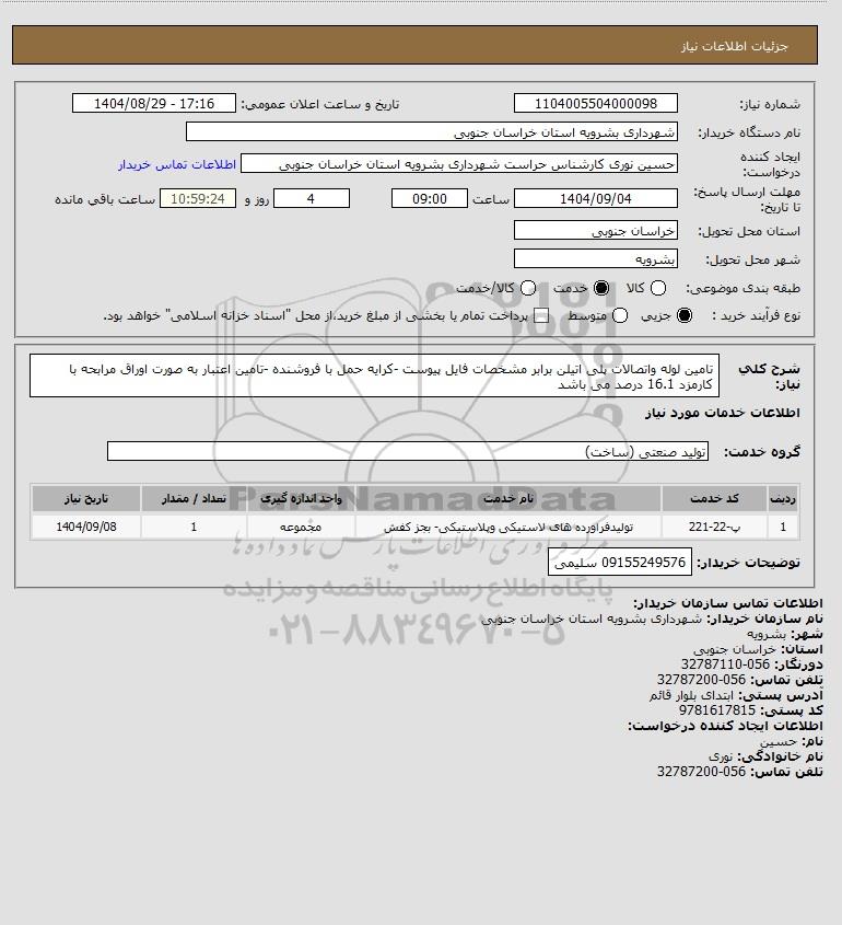 شرح کلی نیاز: تامین لوله واتصالات پلی اتیلن برابر مشخصات فایل پیوست -کرایه حمل با فروشنده -تامین اعتبار به صورت اوراق مرابحه با کارمزد 16.1 درصد می باشد