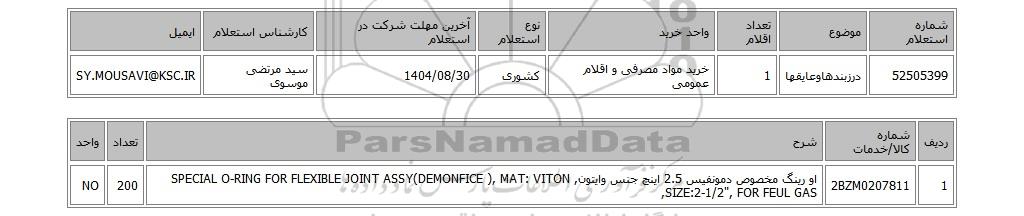 | 52505399 | درزبندهاوعایقها | 1 | خرید مواد مصرفی و اقلام عمومی | کشوری | 1404/08/30 | سید مرتضی موسوی | SY.MOUSAVI@KSC.IR |