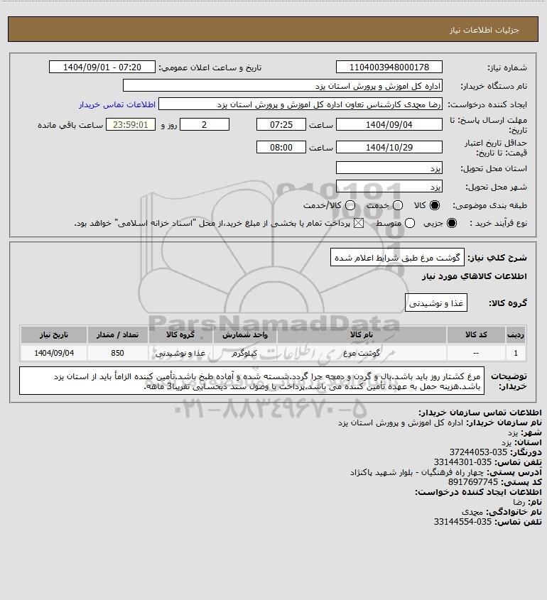 شرح کلی نیاز: گوشت مرغ طبق شرایط اعلام شده