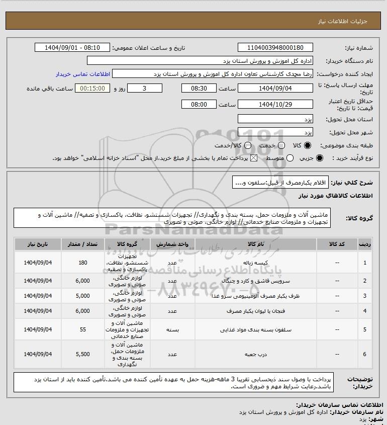 شرح کلی نیاز: اقلام یکبارمصرف از قبیل:سلفون و....
