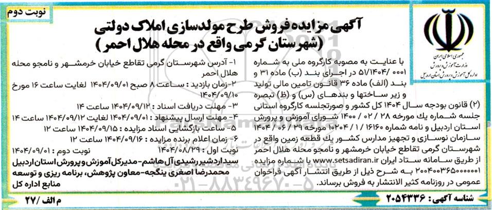 با عنایت به مصوبه کارگروه ملی به شماره 51/1404/0001 در اجرای بند (ب) ماده 31 و بند (الف) ماده 36 قانون تامین مالی تولید و زیرساختها و بندهای (س) و (ظ) تبصره (2) قانون بودجه سال 1404 کل کشور و صورتجلسه کارگروه استانی جلسه شماره یک مورخه 1400.02.28 شورای آموزش و پرورش استان اردبیل و نامه شماره 16160 / 1 / 10204 مورخه 1404.06.29 سازمان نوسازی و تجهیز مدارس کشور یک قطعه زمین واقع در شهرستان گرمی تقاطع خیابان خرمشهر و نامجو محله هلال احمر از طریق سامانه ستاد ایران ستاد ایران با شماره مزایده 2004003650000001 به شرح ذیل از طریق انتشار آگهی فراخوان عمومی در روزنامه کثیر الانتشار به فروش برساند.