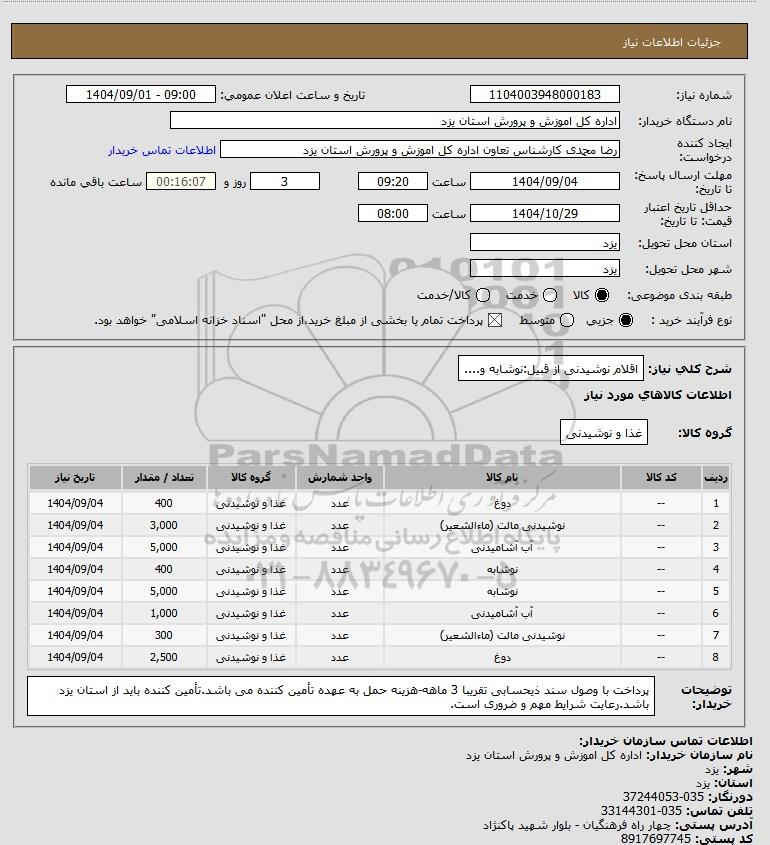 | 3 | -- | آب آشامیدنی | عدد | غذا و نوشیدنی | 5,000 | 1404/09/04 |
