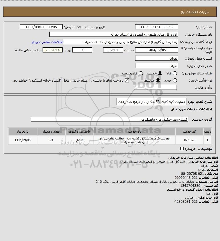 شرح کلی نیاز: عملیات کبه کاری 53 هکتاری از مراتع شمیرانات