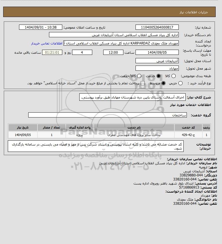 شرح کلی نیاز: اجرای آسفالت روستای پایین دره شهرستان مهاباد طبق برآورد پیوستی.