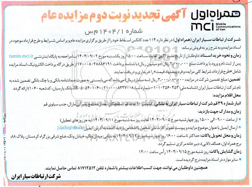 شرکت ارتباطات سیار ایران (همراه اول) در نظر دارد 114 عدد کانکس اسقاط خود را از طریق برگزاری مزایده عام و بر اساس شرایط و طرح قرارداد موجود در اسناد مزایده و به شرح زیر به فروش برساند: