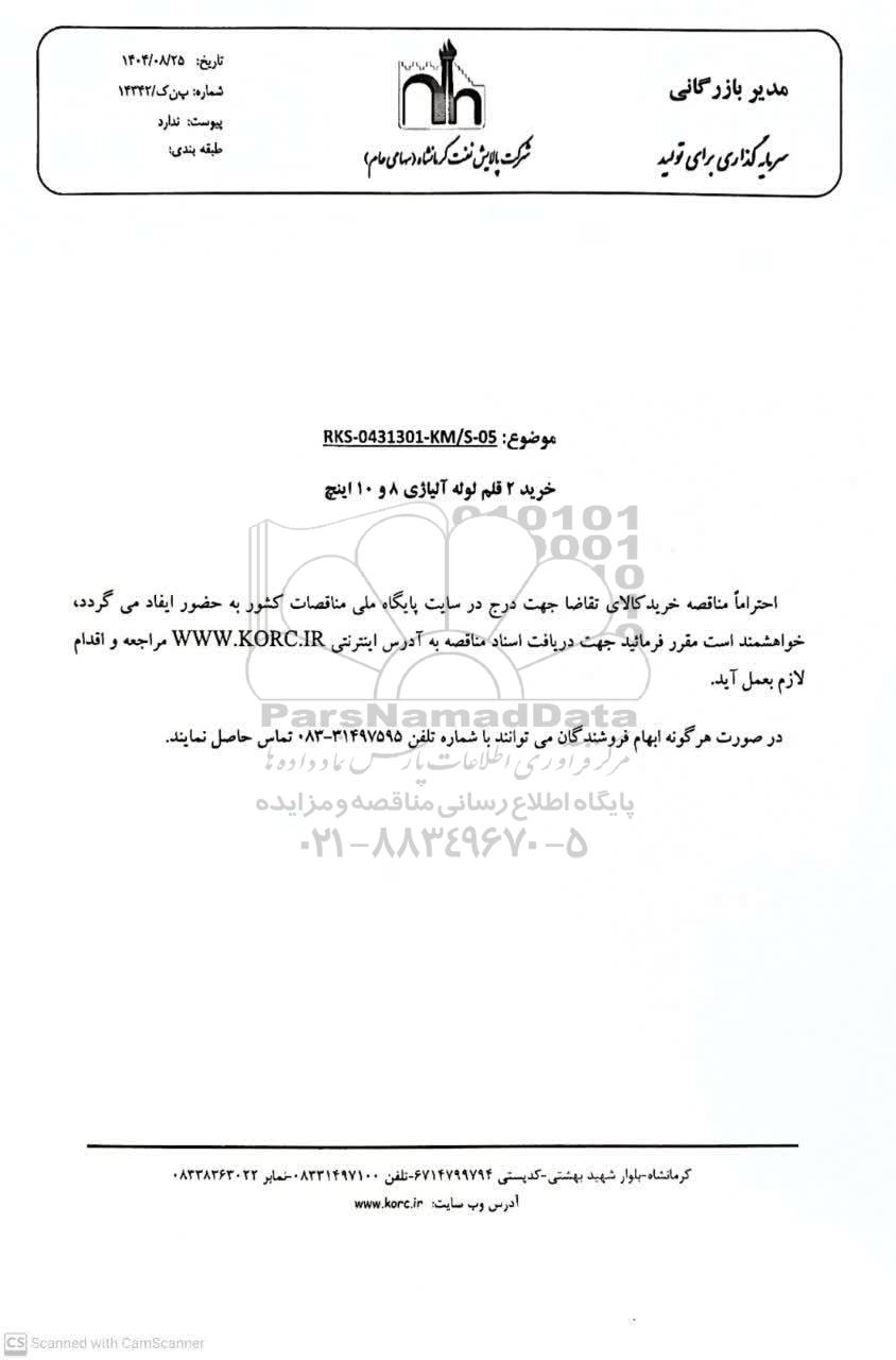 احتراما مناقصه خرید کالای تقاضا جهت درج در سایت پایگاه ملی مناقصات کشور به حضور ایفا می گردد، خواهشمند است مقرر فرمائید جهت دریایفت اسناد مناقصه به آدرس اینترنتی WWW.KORC.IR مراجعه و اقدام لازم بعمل آید.