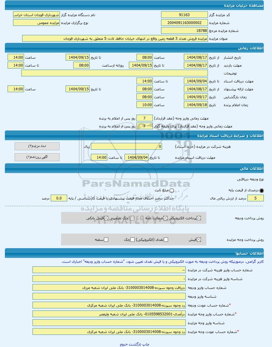 | عنوان مزایده | مزایده فروش تعداد 3 قطعه زمین واقع در انتهای خیابان حافظ، لادن 5 متعلق به شهرداری قوچان -مزایده زمین - استان خراسان رضوی | |||
