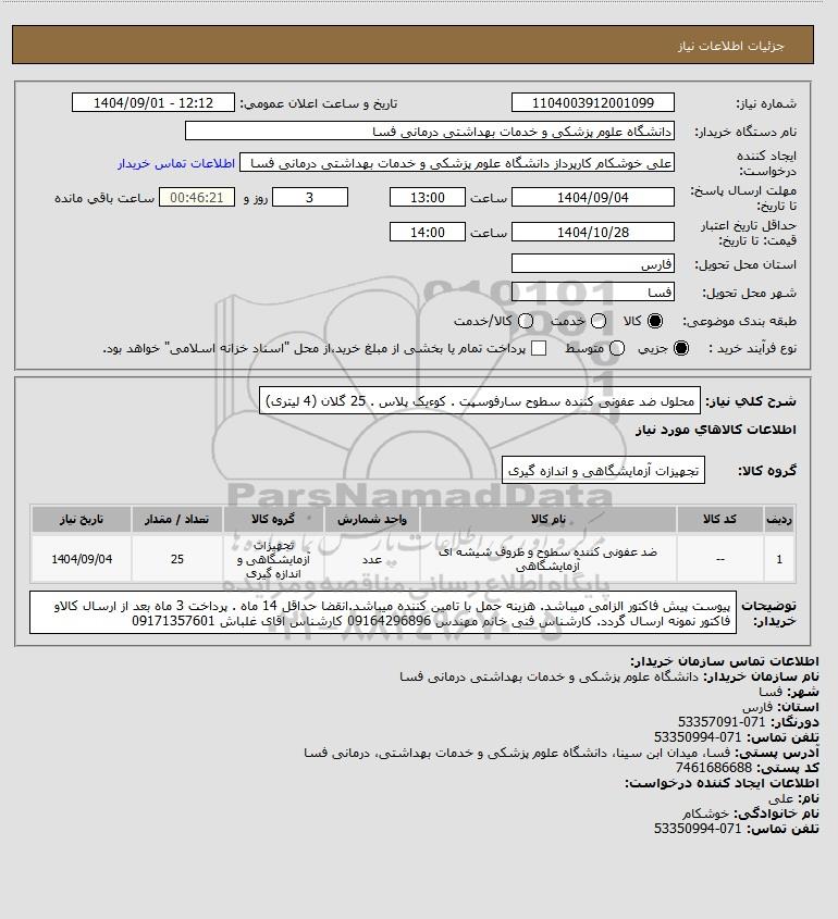 | 1 | -- | ضد عفونی کننده سطوح و ظروف شیشه ای آزمایشگاهی | عدد | تجهیزات آزمایشگاهی و اندازه گیری | 25 | 1404/09/04 |