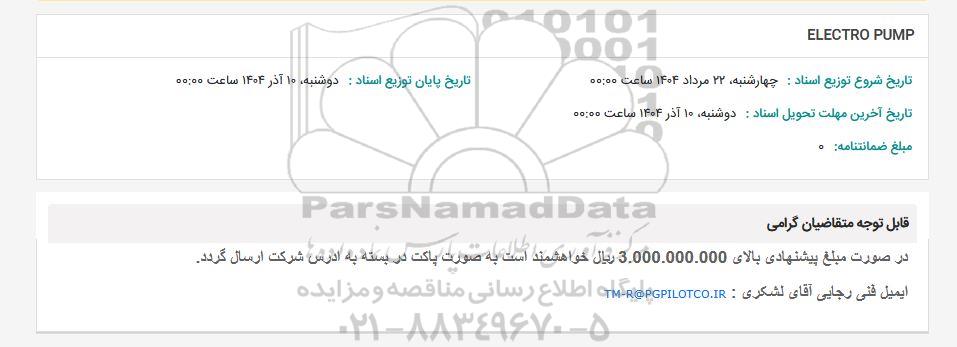 استعلام ELECTRO PUMP  -مناقصه روز شنبه یکم آذر ماه 1404, استعلام ELECTRO PUMP
