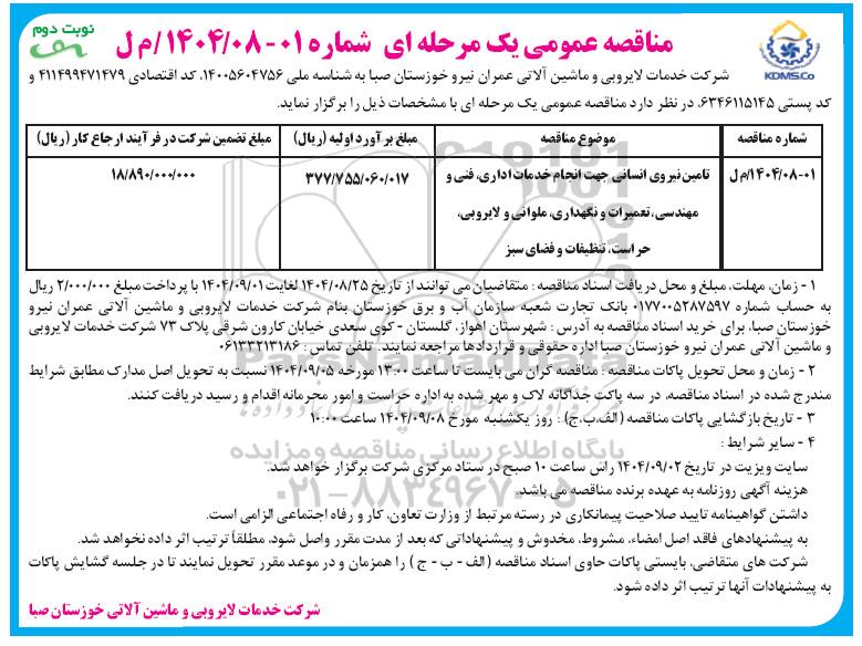 | 01-1404/08 / م ل | تامین نیروی انسانی جهت انجام خدمات اداری،فنی و مهندسی، تعمیرات و نگهداری، ملوانی و لایروبی، حراست،تنظیفات و فضای سبز | 377.755.060.017 | 18.890.000.000 |