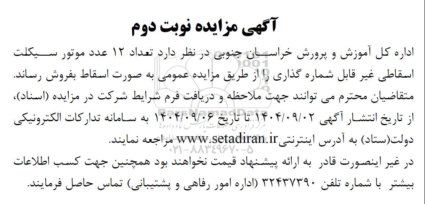 اداره کل آموزش و پرورش خراسان جنوبی در نظر دارد تعداد 12 عدد موتورسیکلت اسقاطی غیرقابل شماره گذاری را از طریق مزایده عمومی به صورت اسقاط بفروش رساند. متقاضیان محترم می توانند جهت ملاحظه و دریافت فرم شرایط شرکت در مزایده (اسناد) از تاریخ انتشار آگهی 1404.9.2 تا تاریخ 1404.9.6 به سامانه تدارکات الکترونیکی دولت (ستاد) به آدرس اینترنتی ستاد ایران مراجعه نمایند.
