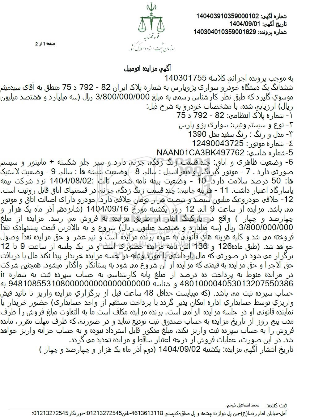 به موجب پرونده اجرائی کلاسه 140301755 ششدانگ یک دستگاه خودرو سواری پژو پارس به شماره پلاک ایران 2 - 792 د 75 متعلق به آقای سید میثم موسوی گلیرد که طبق نظر کارشناس رسمی به مبلغ 3.800.000.000 ریال سه میلیارد و هشتصد میلیون