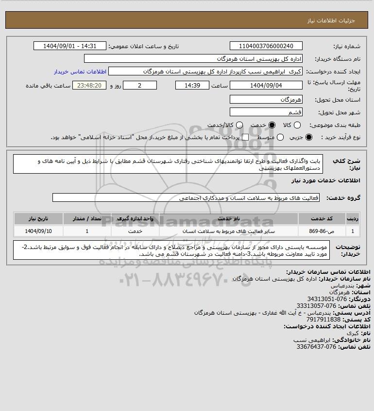 شرح کلی نیاز: بابت واگذاری فعالیت و طرح ارتقا توانمندیهای شناختی رفتاری شهرستان قشم مطابق با شرایط ذیل و آیین نامه های و دستورالعملهای بهزیستی