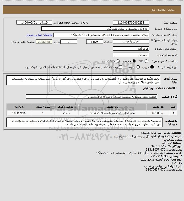 شرح کلی نیاز: بابت واگذاری فعالیت خودمراقبتی و آگاهسازی با تاکید تاب آوری و مهارت ورزی (طر ح خاتم) شهرستان پارسیان به موسسات غیر دولتی دارای مجوز از بهزیستی
