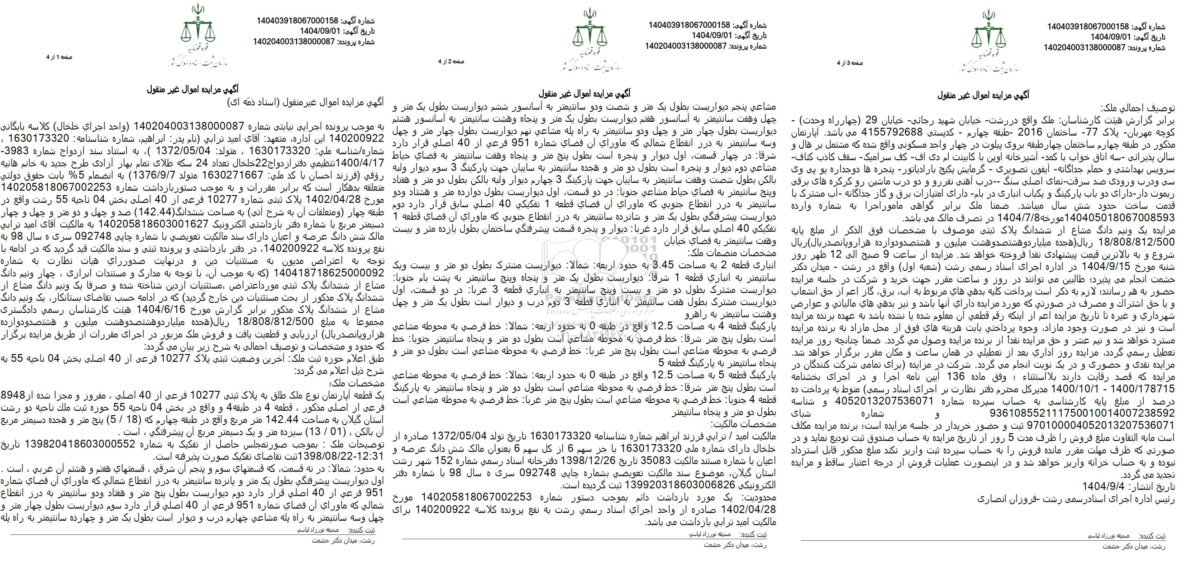 مزایده پلاک ثبتی شماره 10277 فرعی از 40 اصلی بخش 04 کلاسه 1402000922