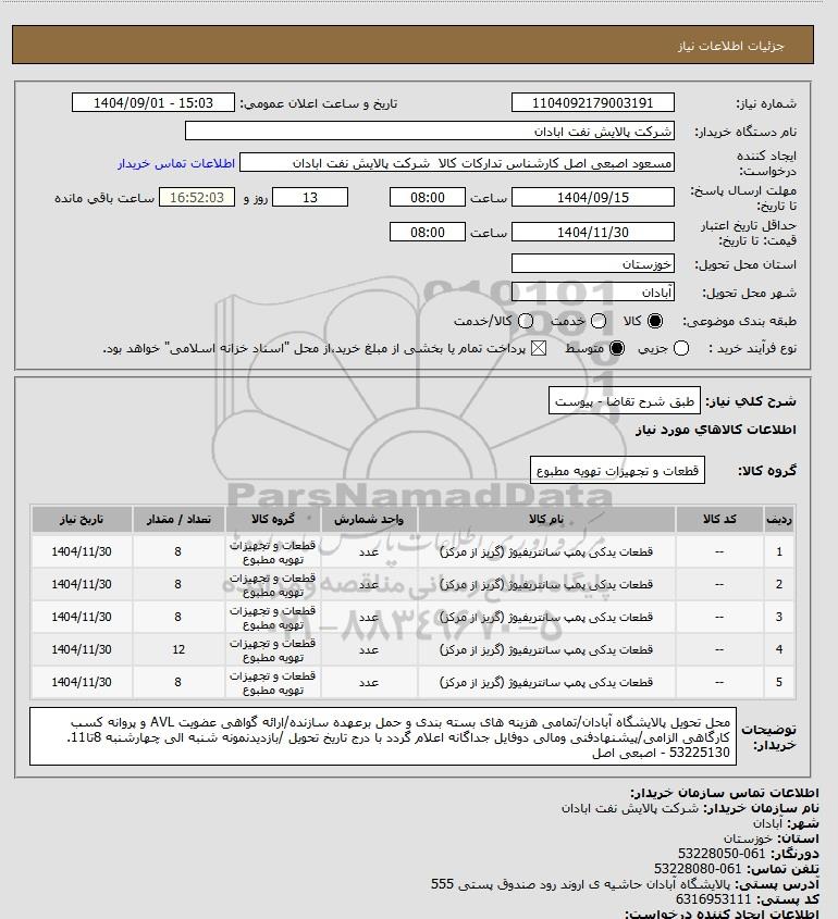 | 5 | -- | قطعات یدکی پمپ سانتریفیوژ (گریز از مرکز) | عدد | قطعات و تجهیزات تهویه مطبوع | 8 | 1404/11/30 |