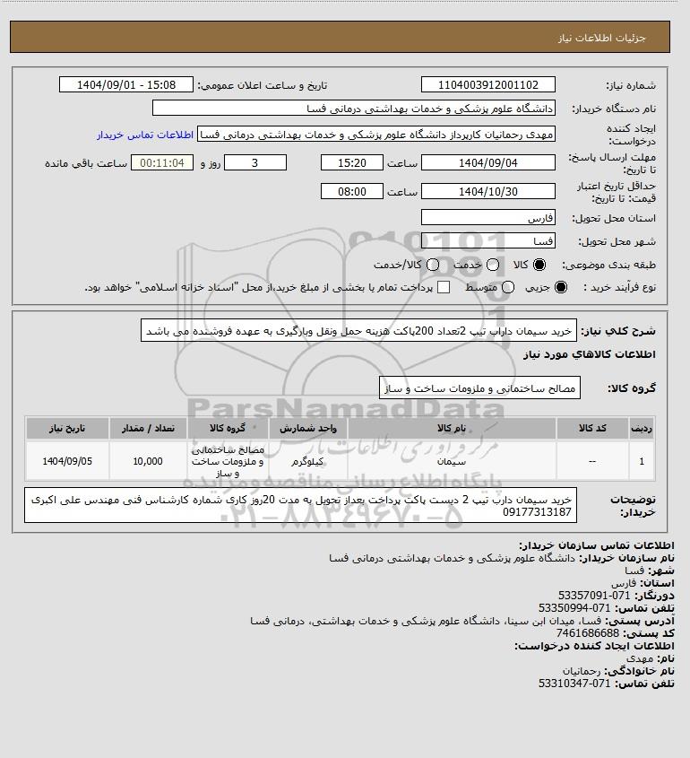 توضیحات خریدار:خرید سیمان دارب تیپ 2 دیست پاکت پرداخت بعداز تحویل به مدت 20روز کاری شماره کارشناس فنی مهندس علی اکبری 09177313187