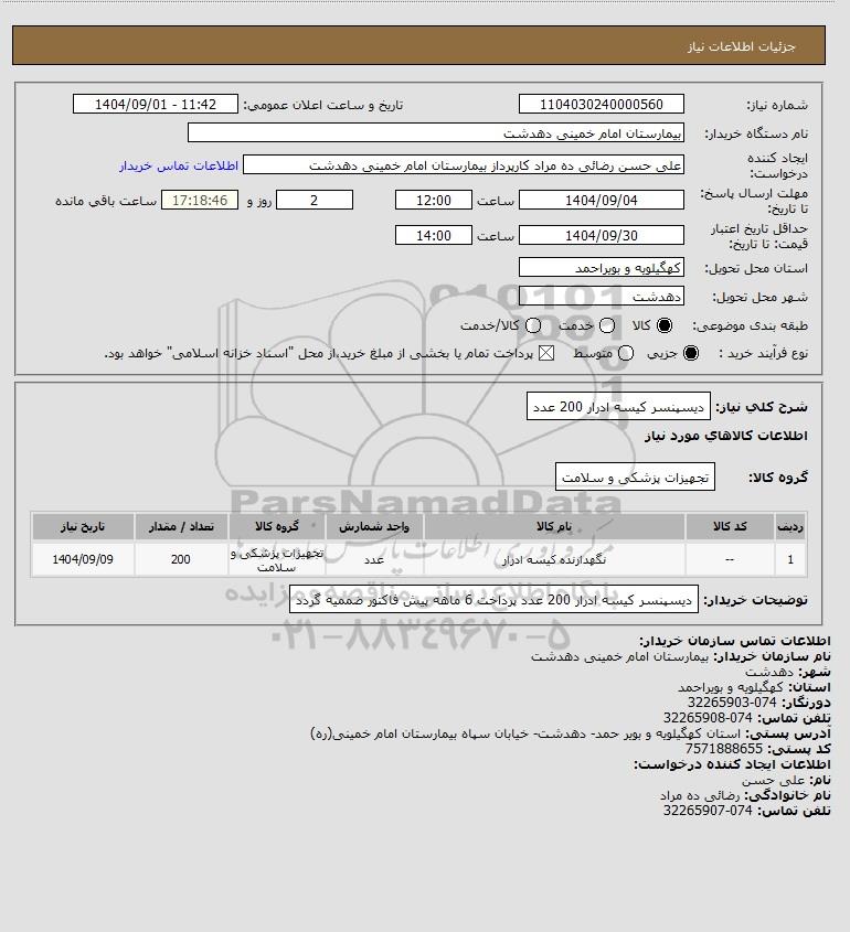 شرح کلی نیاز: دیسپنسر کیسه ادرار 200 عدد