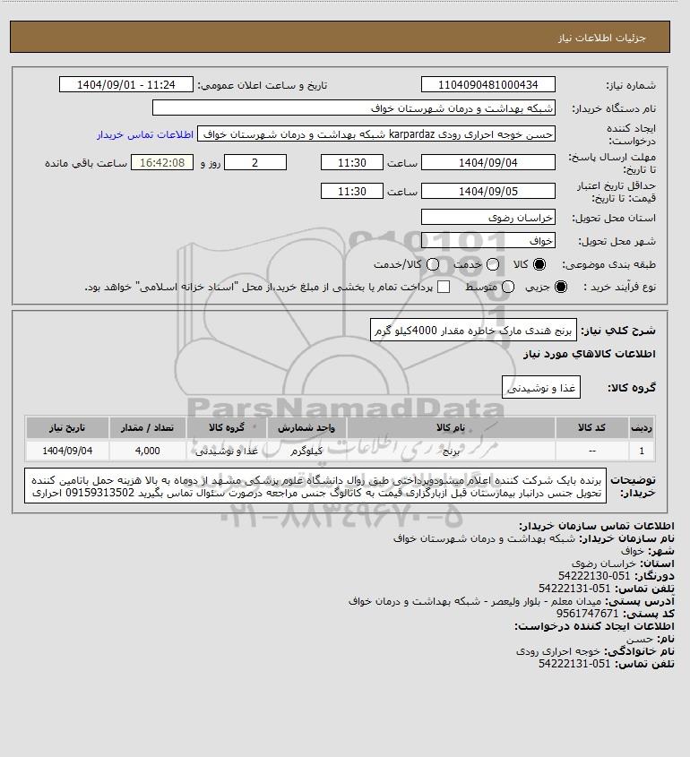 شرح کلی نیاز: برنج هندی مارک خاطره مقدار 4000کیلو گرم