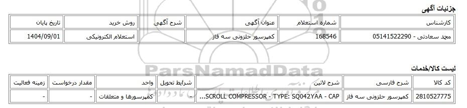 | محمد سعادتی - 05141522290 | 168546 | کمپرسور حلزونی سه فاز | استعلام الکترونیکی | 1404/09/01 |