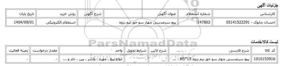 | احسان چابوک - 05141522291 | 147802 | پیچ سرعدسی چهار سو خور نیم رزوه | استعلام الکترونیکی | 1404/09/01 |