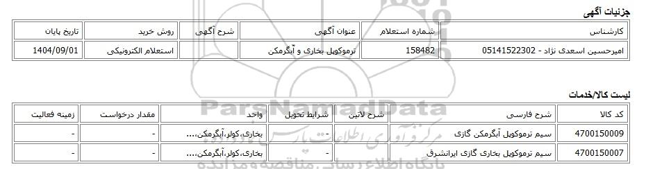 | امیرحسین اسعدی نژاد - 05141522302 | 158482 | ترموکوپل بخاری و آّبگرمکن | استعلام الکترونیکی | 1404/09/01 |