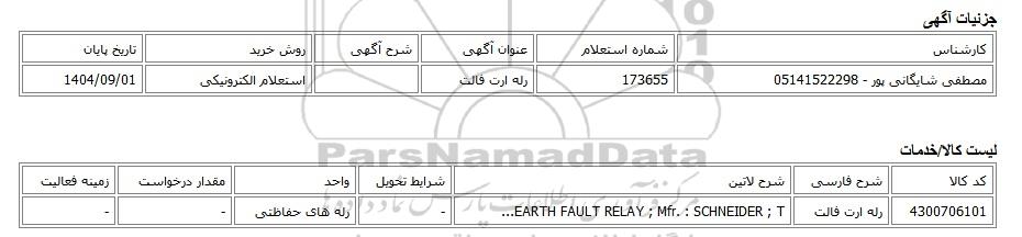 | مصطفی شایگانی پور - 05141522298 | 173655 | رله ارت فالت | استعلام الکترونیکی | 1404/09/01 |