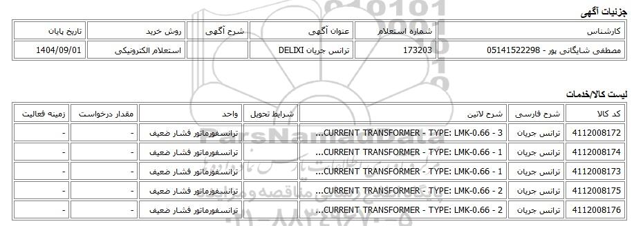| مصطفی شایگانی پور - 05141522298 | 173203 | ترانس جریان DELIXI | استعلام الکترونیکی | 1404/09/01 |