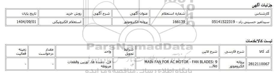 | سیدامیر حسینی راد - 05141522319 | 166139 | پروانه الکتروموتور | استعلام الکترونیکی | 1404/09/01 |