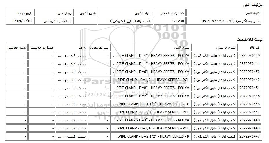 | علی رستگار محمدآبادی - 05141522292 | 171230 | کلمپ لوله ( عایق الکتریکی ) | استعلام الکترونیکی | 1404/09/01 |