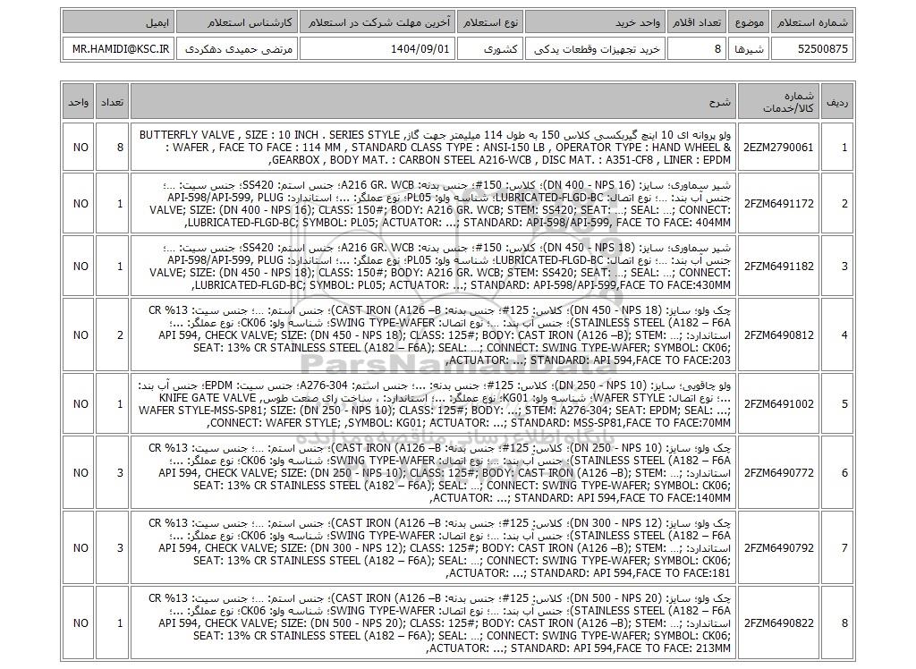 | 52500875 | شیرها | 8 | خرید تجهیزات وقطعات یدکی | کشوری | 1404/09/01 | مرتضی حمیدی دهکردی | MR.HAMIDI@KSC.IR |