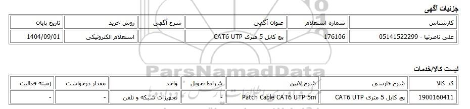 | علی ناصرنیا - 05141522299 | 176106 | پچ کابل 5 متری CAT6 UTP | استعلام الکترونیکی | 1404/09/01 |