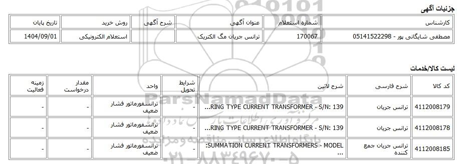 | مصطفی شایگانی پور - 05141522298 | 170067 | ترانس جریان مگ الکتریک | استعلام الکترونیکی | 1404/09/01 |