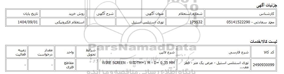 | محمد سعادتی - 05141522290 | 175532 | توری استنلس استیل | استعلام الکترونیکی | 1404/09/01 |